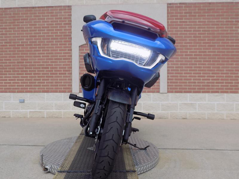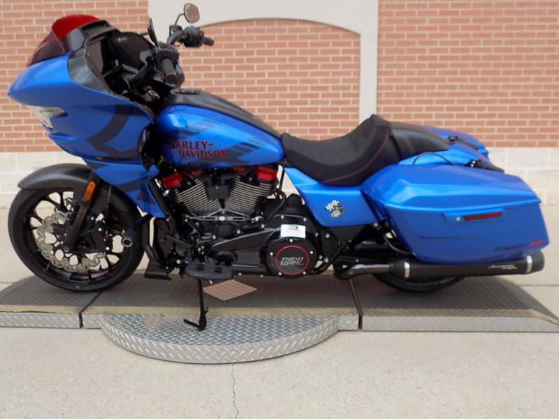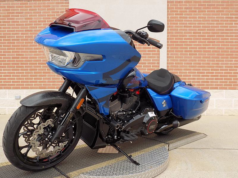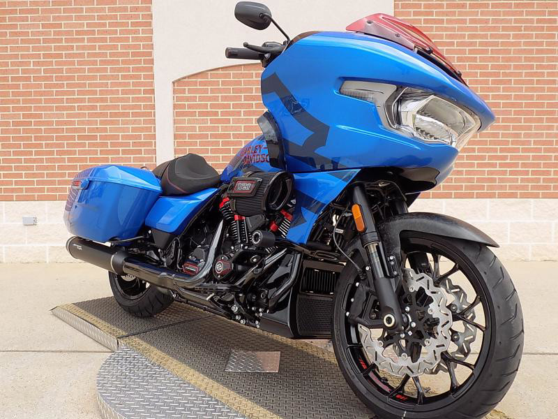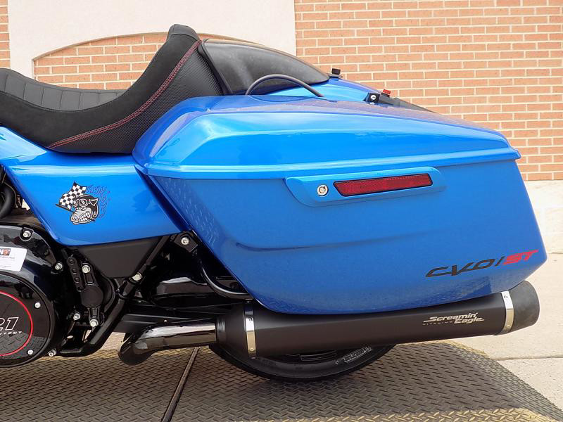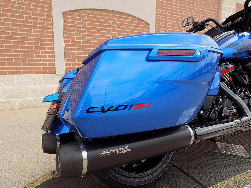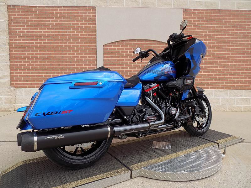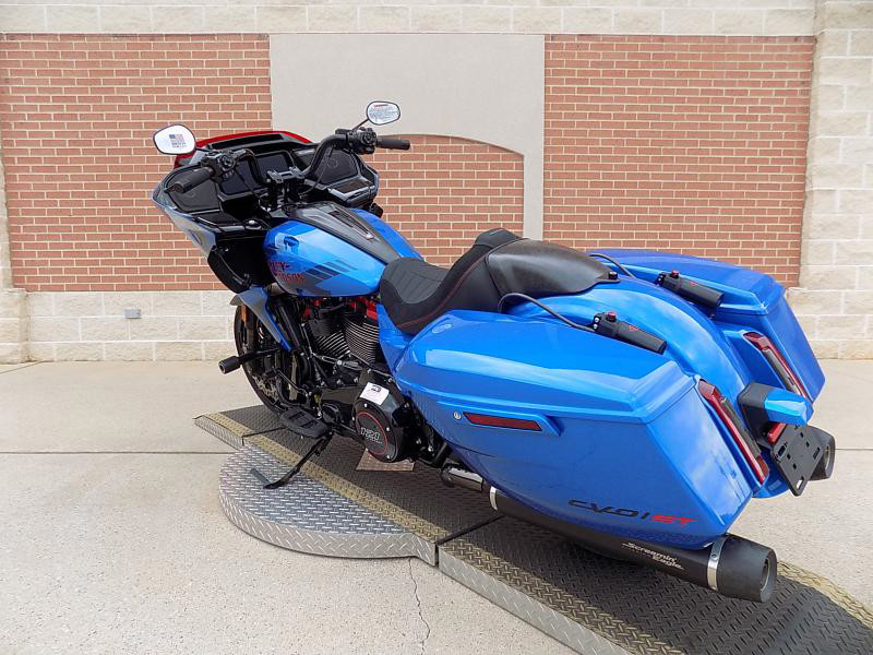 The CVO Road Glide ST's striking exterior features an "Electric Coast with Pinstripe" color scheme, which effortlessly captures attention wherever you ride. This unique and electrifying hue, complemented by the detailed pinstripe, not only enhances its visual appeal but reflects the innovative spirit Harley-Davidson is known for.