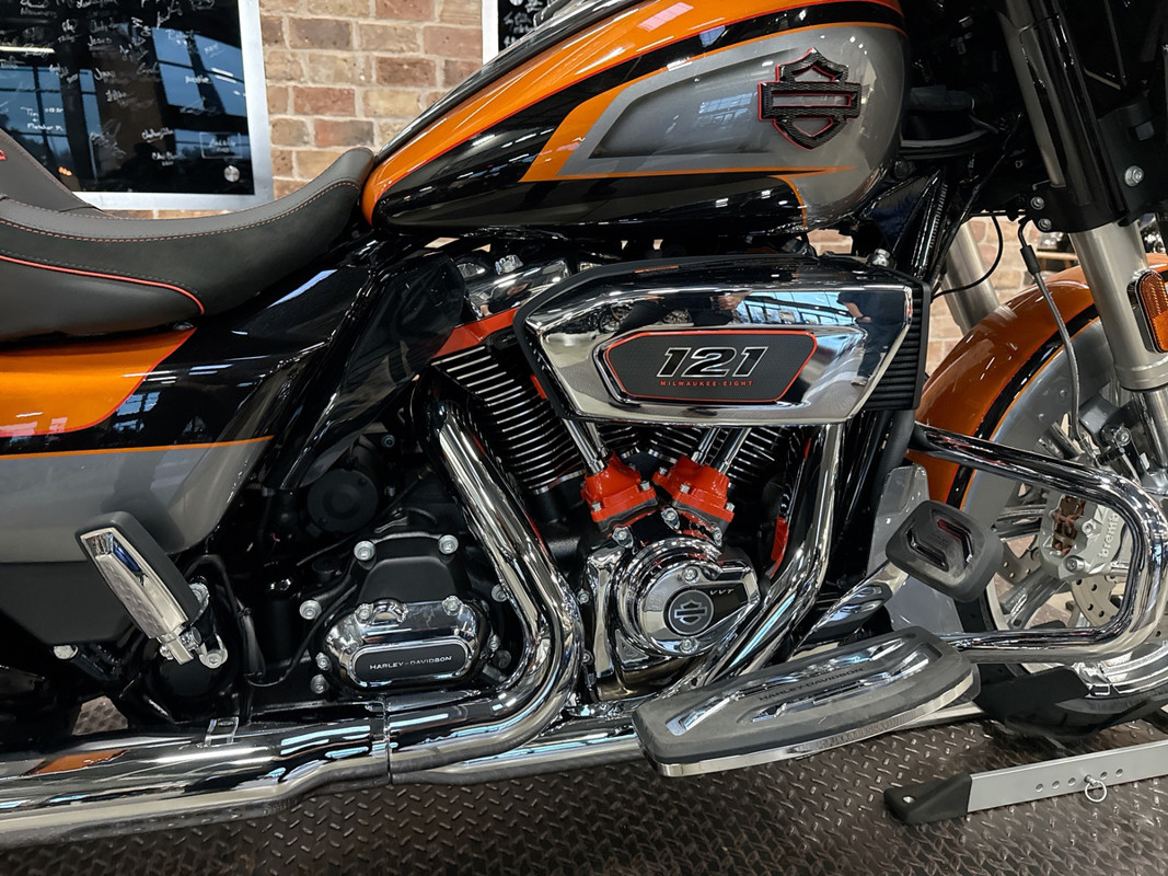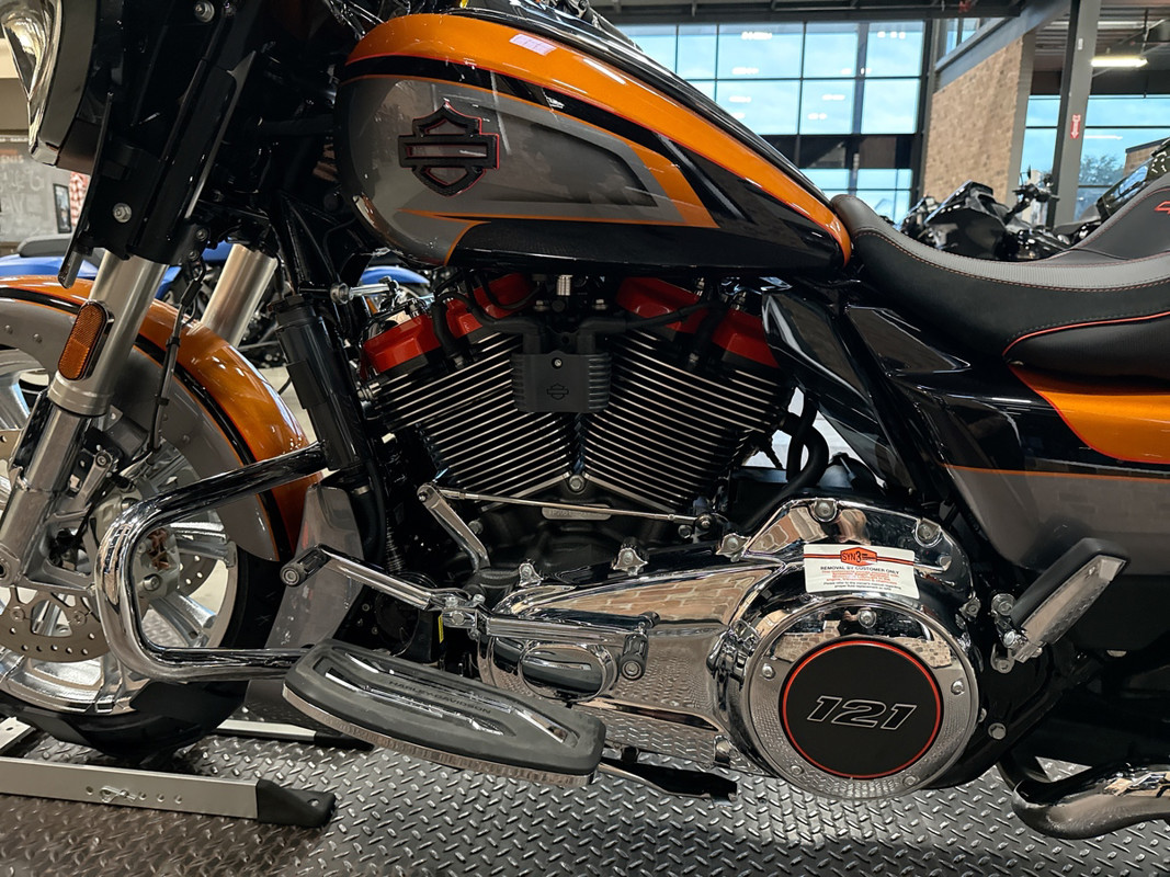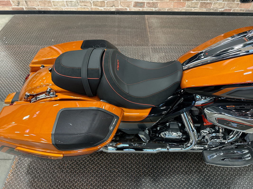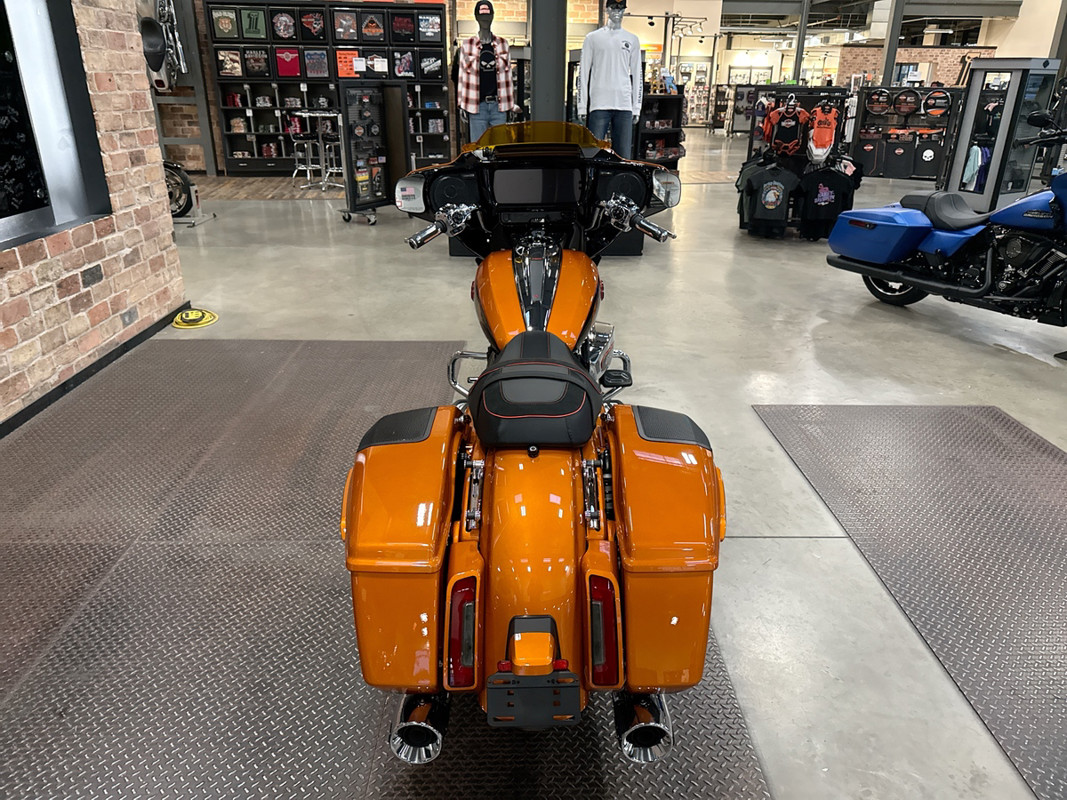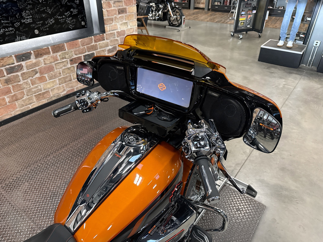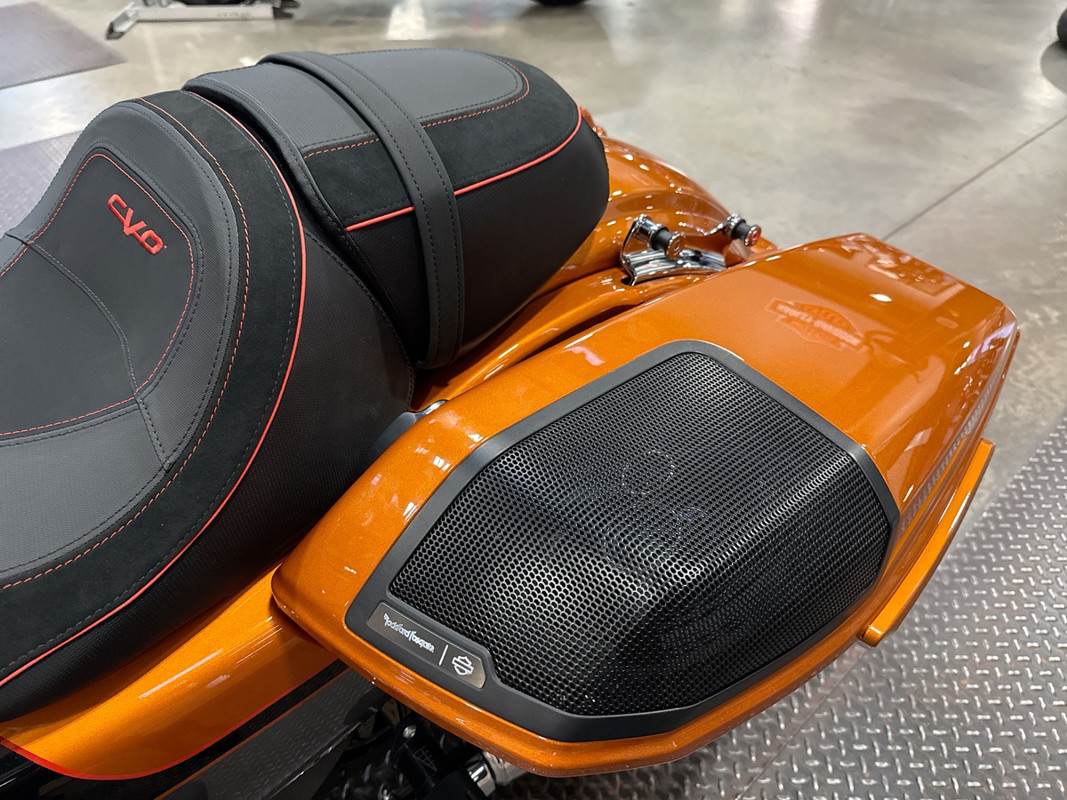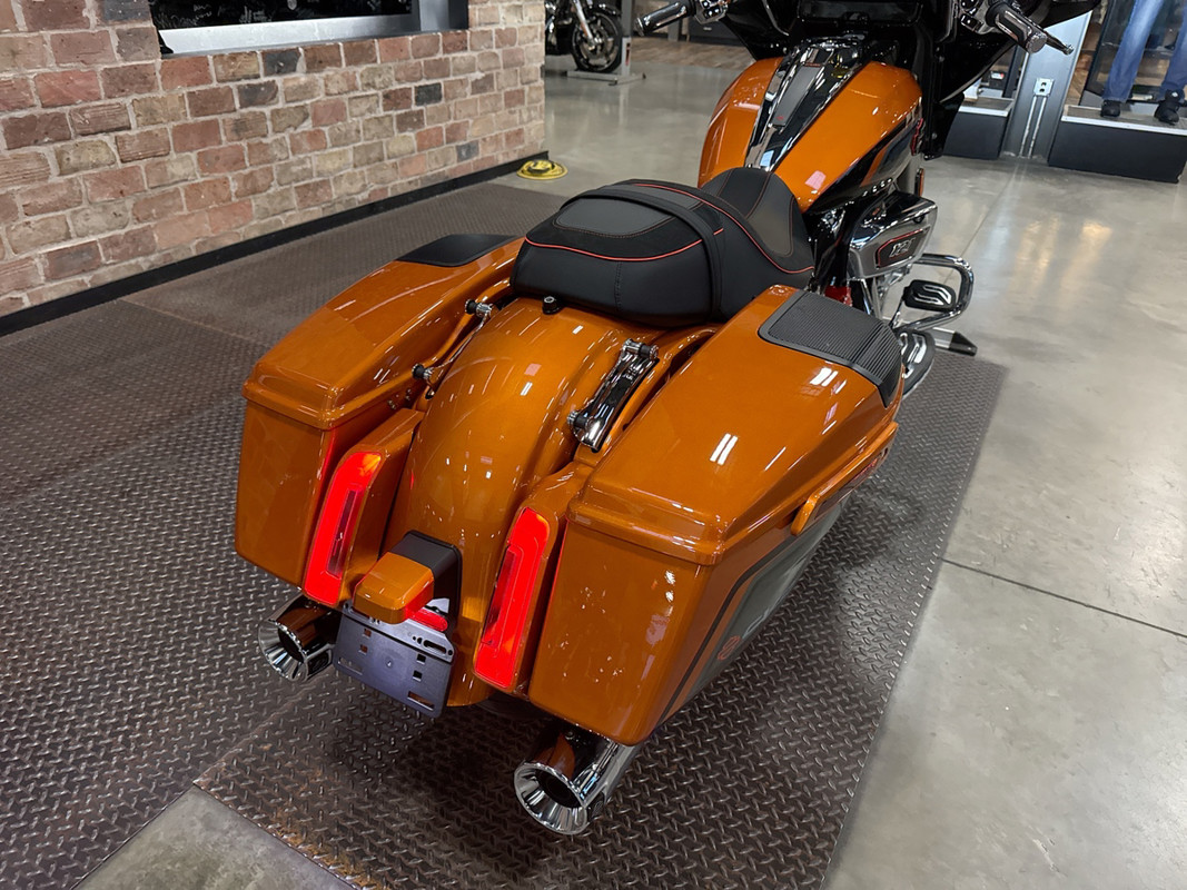 Finished in a stunning Torched Orange with Pinstripe exterior, the CVO Street Glide boasts an unmistakable look that screams authenticity and boldness. This color vividly reflects the passionate Harley-Davidson spirit, making it not just a ride but a statement on the road.