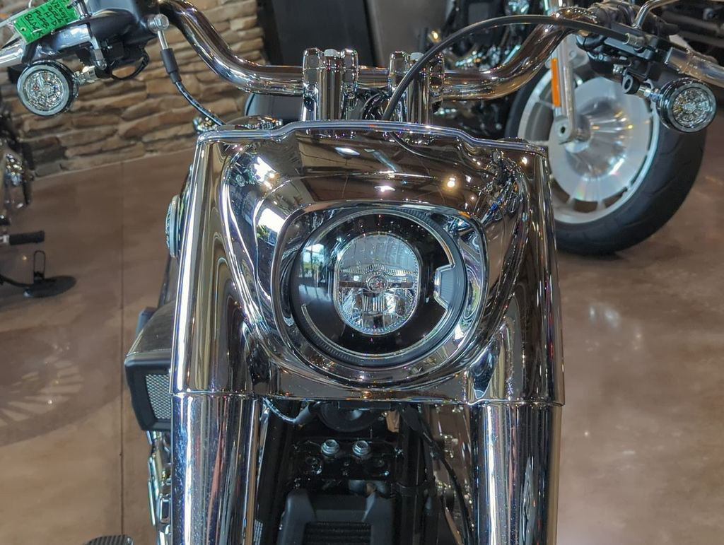 A sculpted chrome nacelle frames the front end of the Fat Boy, lit by a powerful 7" LED headlamp. Bright LED signals complete the bike’s all-around LED lighting package, blending timeless style with modern visibility. It’s a classic face, sharpened through a modern lens.