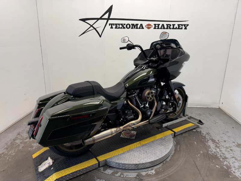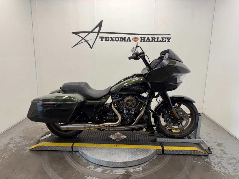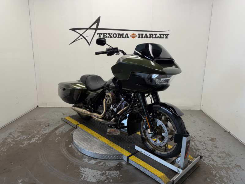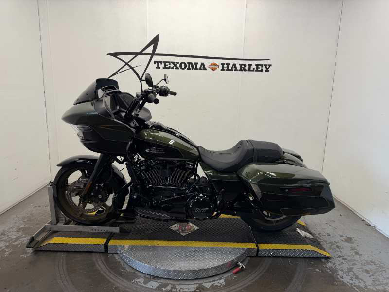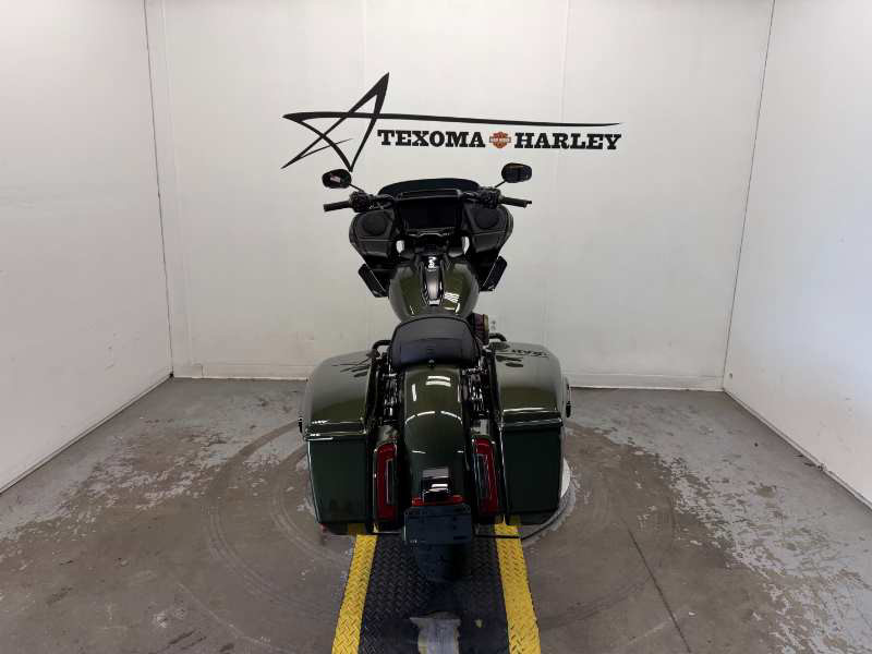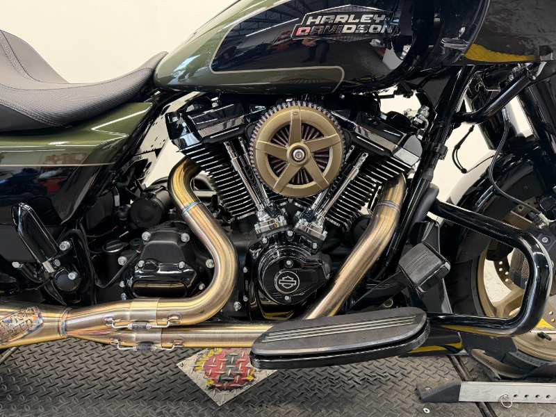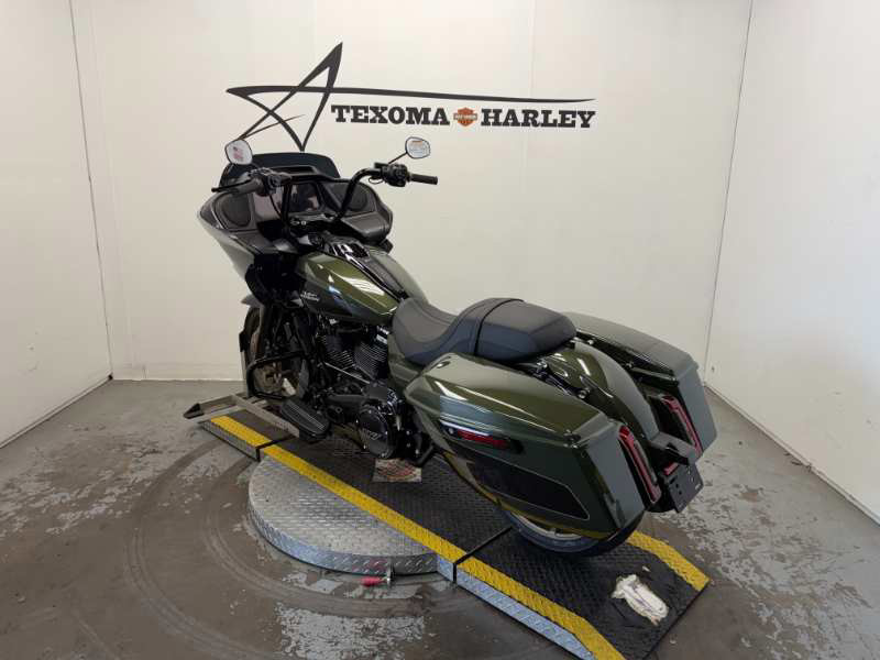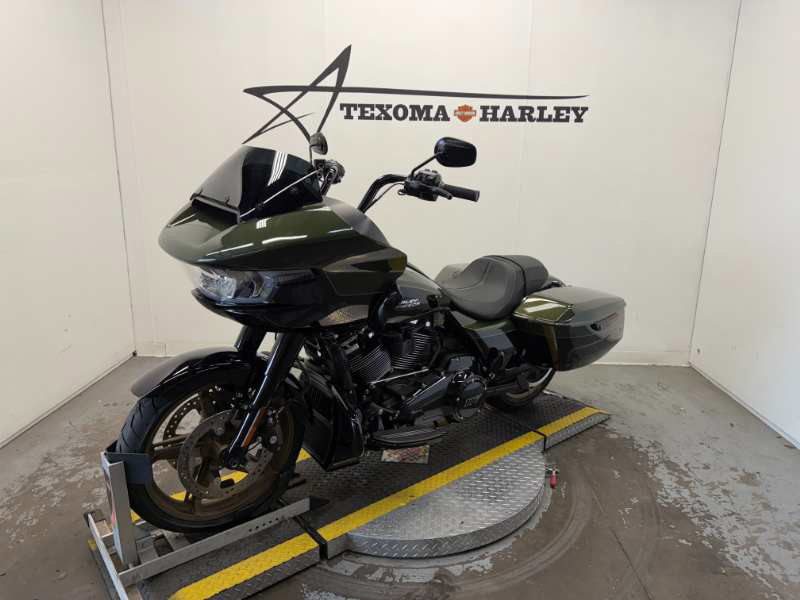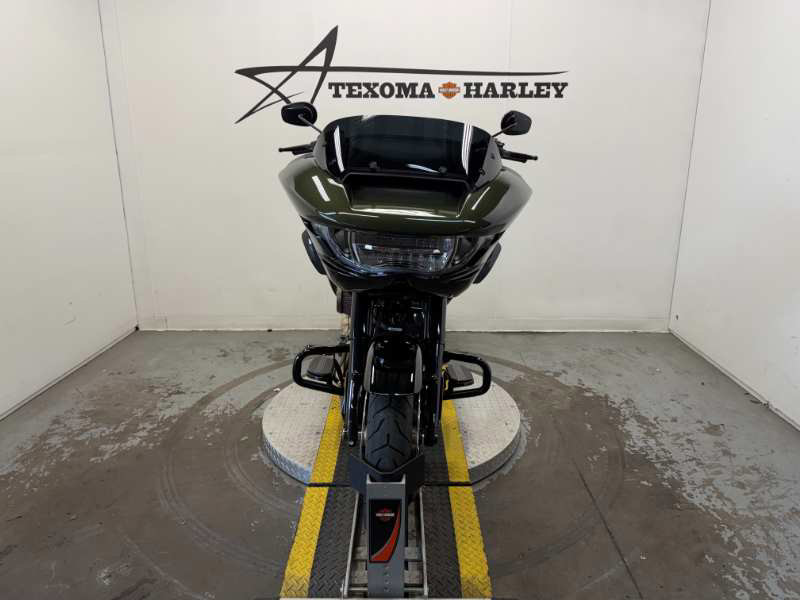 This Road Glide is draped in a striking Olive Steel Metallic and Black finish with pinstriping, showcasing its bold and authentic design. The unique color scheme highlights the sleek lines and muscular stance, ready to turn heads wherever your journey takes you. ??