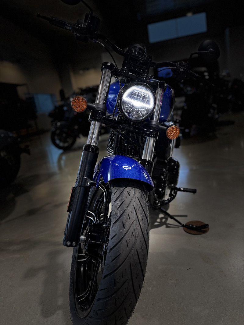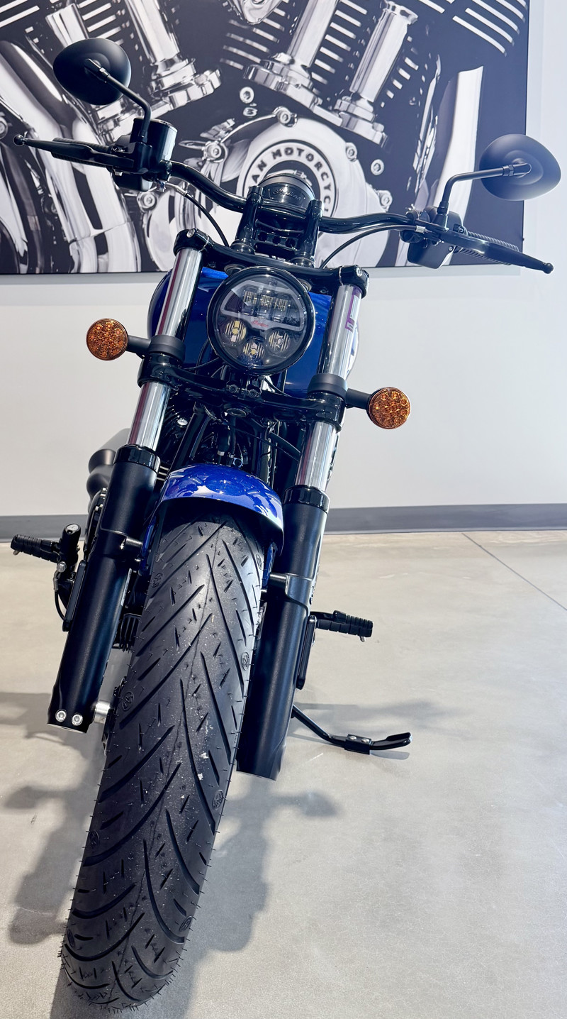 A stripped down cruiser with modern capability, blacked-out finishes, mid-mount foot controls and drag handlebars with the 116 cu-in Thunderstroke engine and 4" Display powered by RIDE COMMAND.